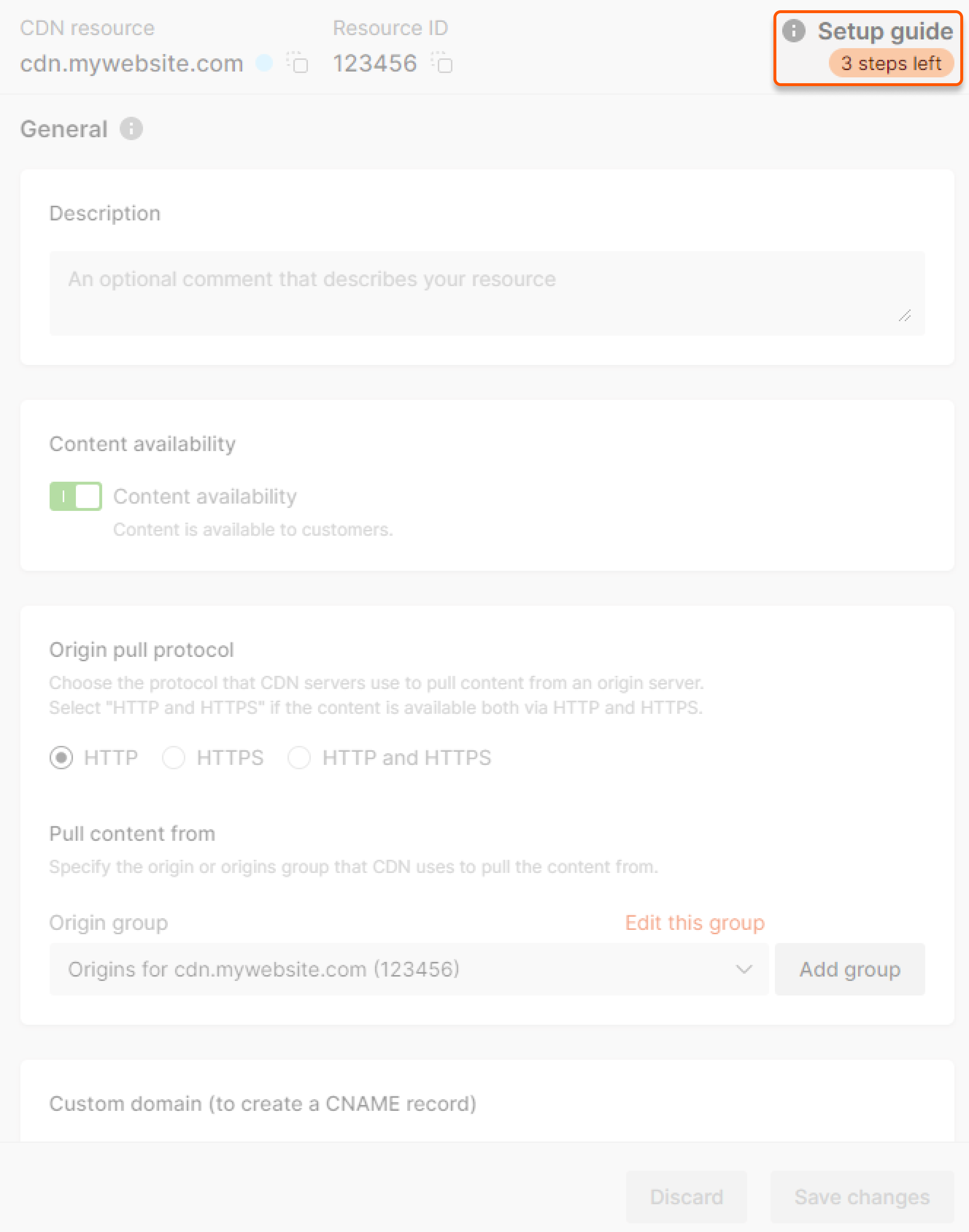 The instructions below describe how to set up a custom domain for static CDN resources with the addition of a CNAME record. Setting up a custom domain for CDN resources integrated with the entire site is different and involves delegating the domain to CDB's NS servers. Check out the article to learn more: Create a CDN resource for the entire site.