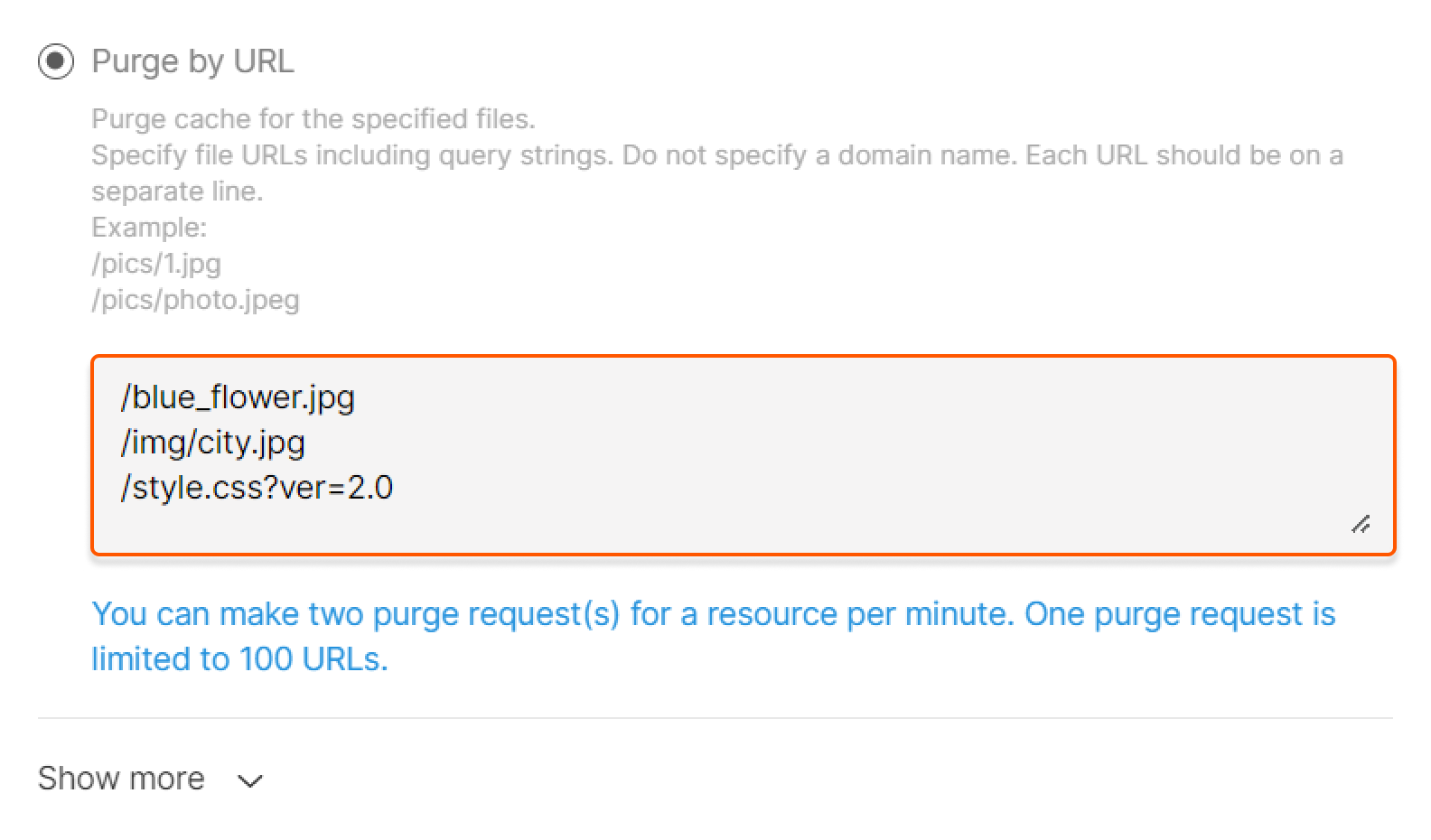 You can make two purge requests per resource per minute. One purge request is limited to 100 URLs. Therefore, you can remove up to 200 files from the cache per minute.