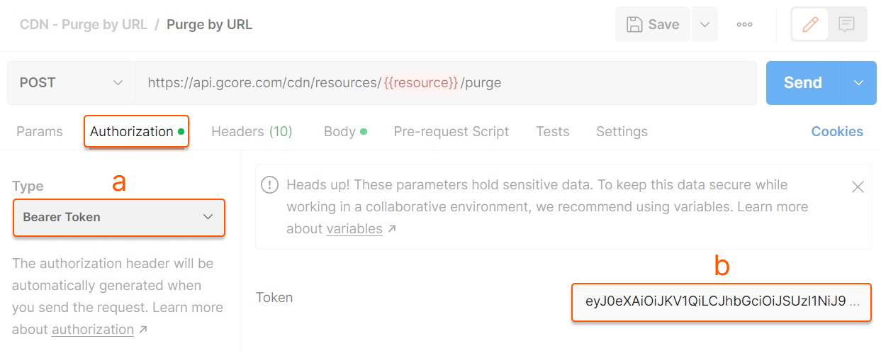 b. Enter the resource URL in the request URL field. Replace **{{resource_id}}** with your actual value.
