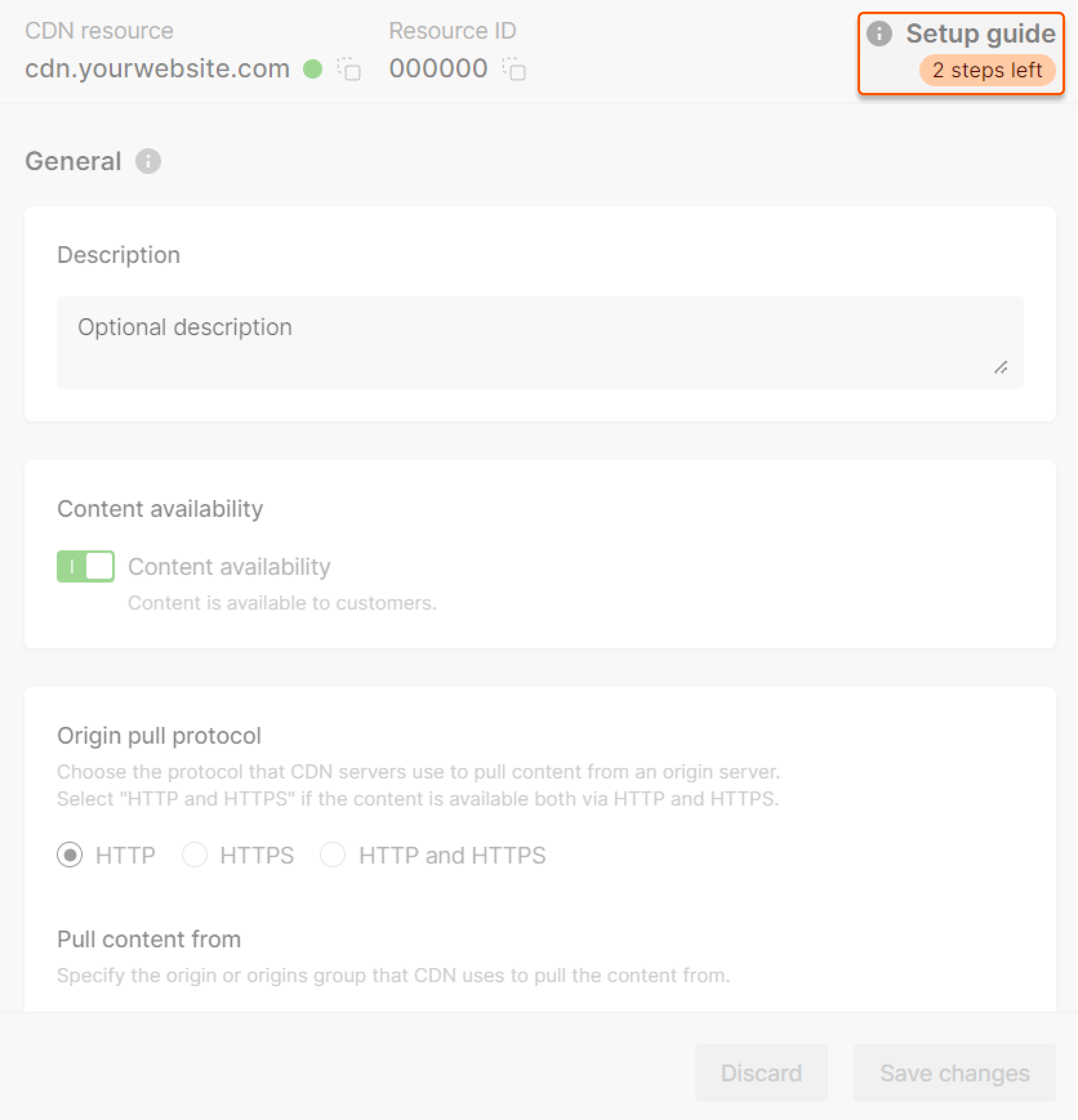 1. Click Setup guide. You will see a sliding panel indicating the status of each step of CDN resource creation.