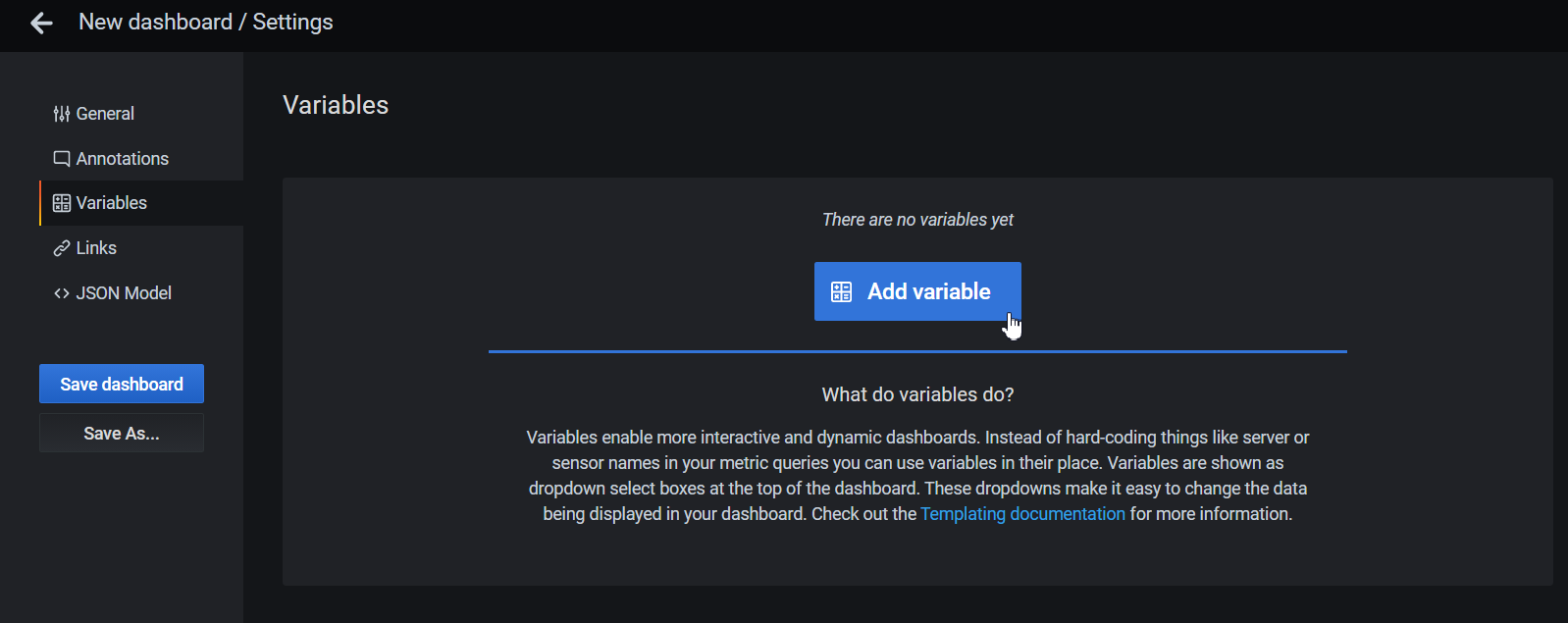 Save the Dashboard. To do this, click "Save" in the upper-right corner of the panel.