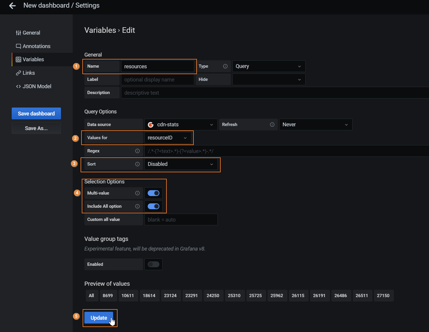For example, to be able to filter resources, you need to make the following settings and click "Update":