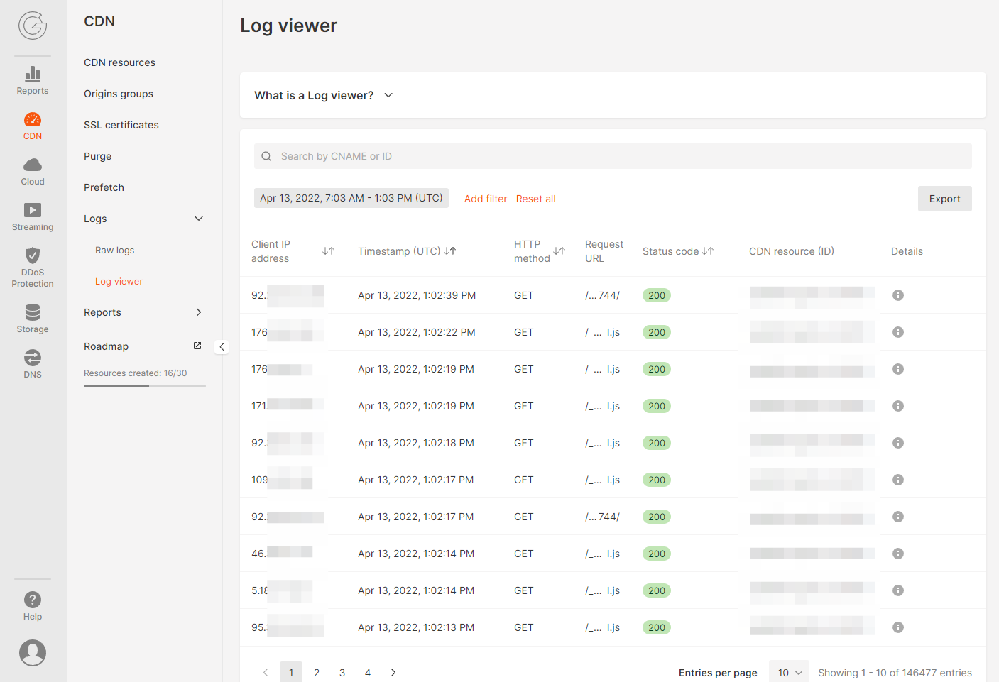Log Viewer is a free tool designed to view and export logs of CDN resources to your device. With it, you can see and download information about requests to your resources. The service stores the logs that were recorded for the last 3 days of CDN operation.