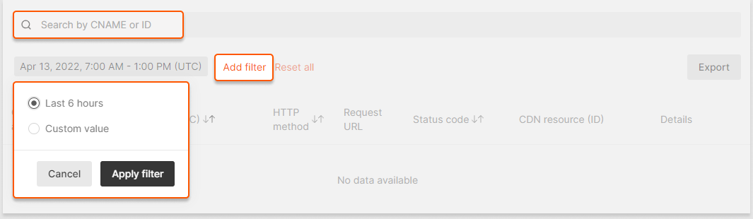 • To see logs of a specific CDN resource, enter its CNAME or ID.