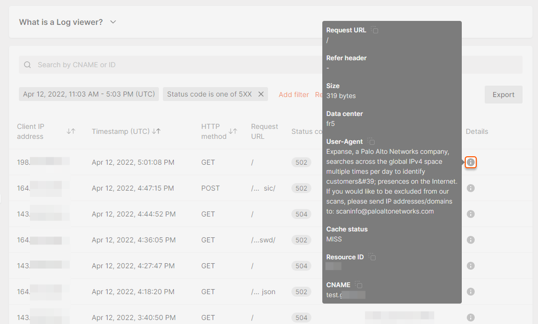 To see more details about a log, hover the mouse over the "i" icon on the right. You will see twelve request parameters.