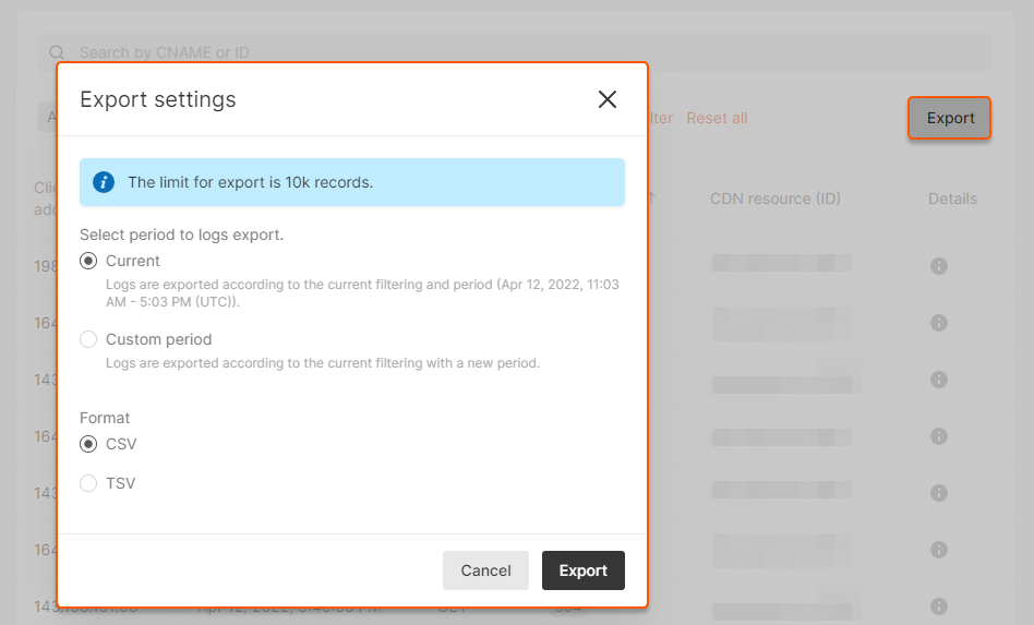 1. Click the "Export" button on the right side of the page. 2. Select the time range of logs you want to download: you can keep the current period (selected in filters when viewing), or set a new value. 3. Choose the export format: CSV or TSV. 4. Click Export.