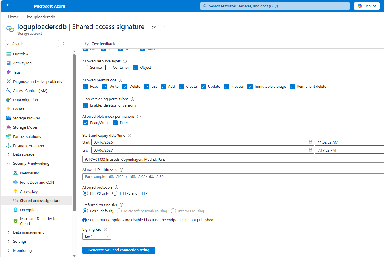 Go to security + Networking > Shared access signature