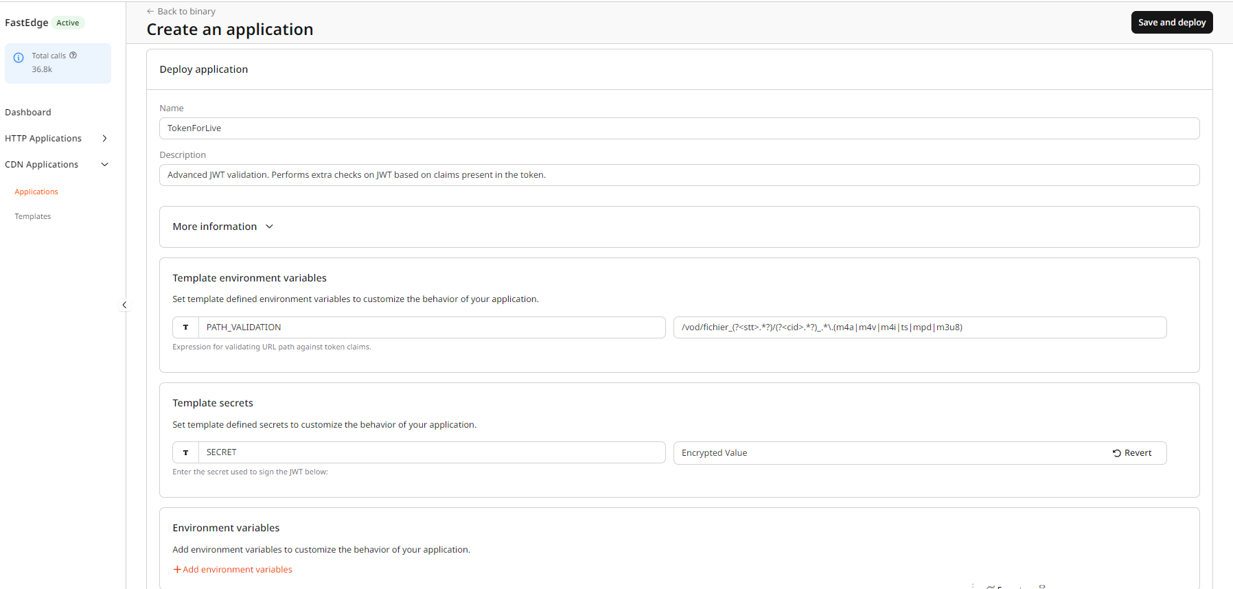 - Fill in the name, path_validation and the shared key that will be used to sign the token, then click on Save and Deploy.
