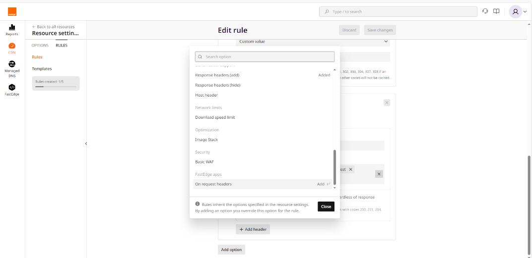 - Or to a rule that matches a pattern. For that, select the rule, click on Add option, and select request header and rewrite option.