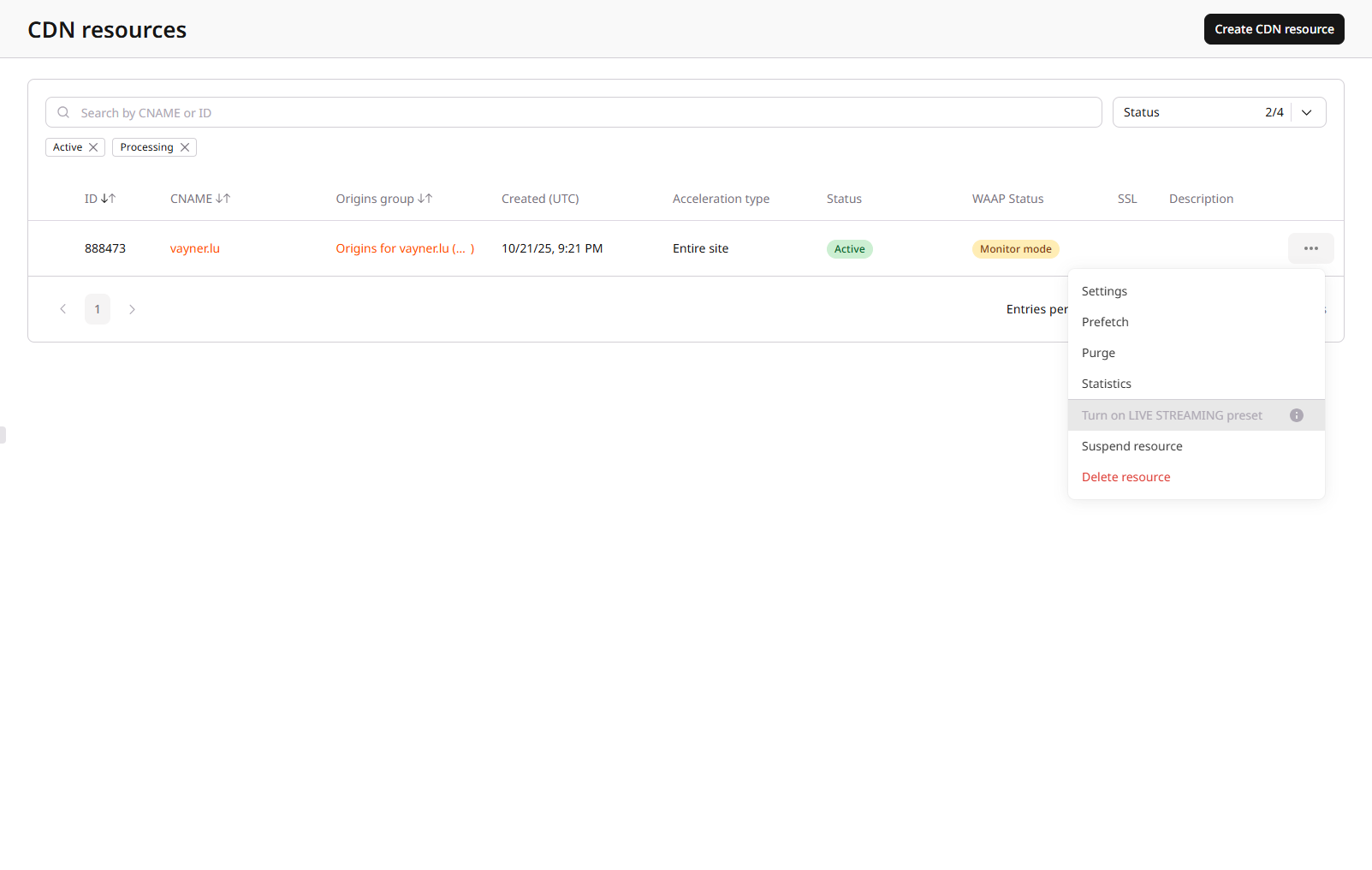 After you activate WAAP for your domain in CDN, it will appear on the Domains page in the CDB Technical Web Portal. Here, you can view all domains and their statuses, navigate to the CDN settings, and delete inactive domains.