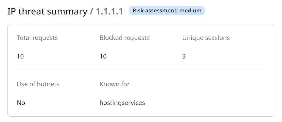 It operates on the IP-related information we collect from our network to give you insights about the clients that access your domains. This information helps you make better decisions when creating WAF rules and helps with policy configuration to prevent and mitigate attacks.